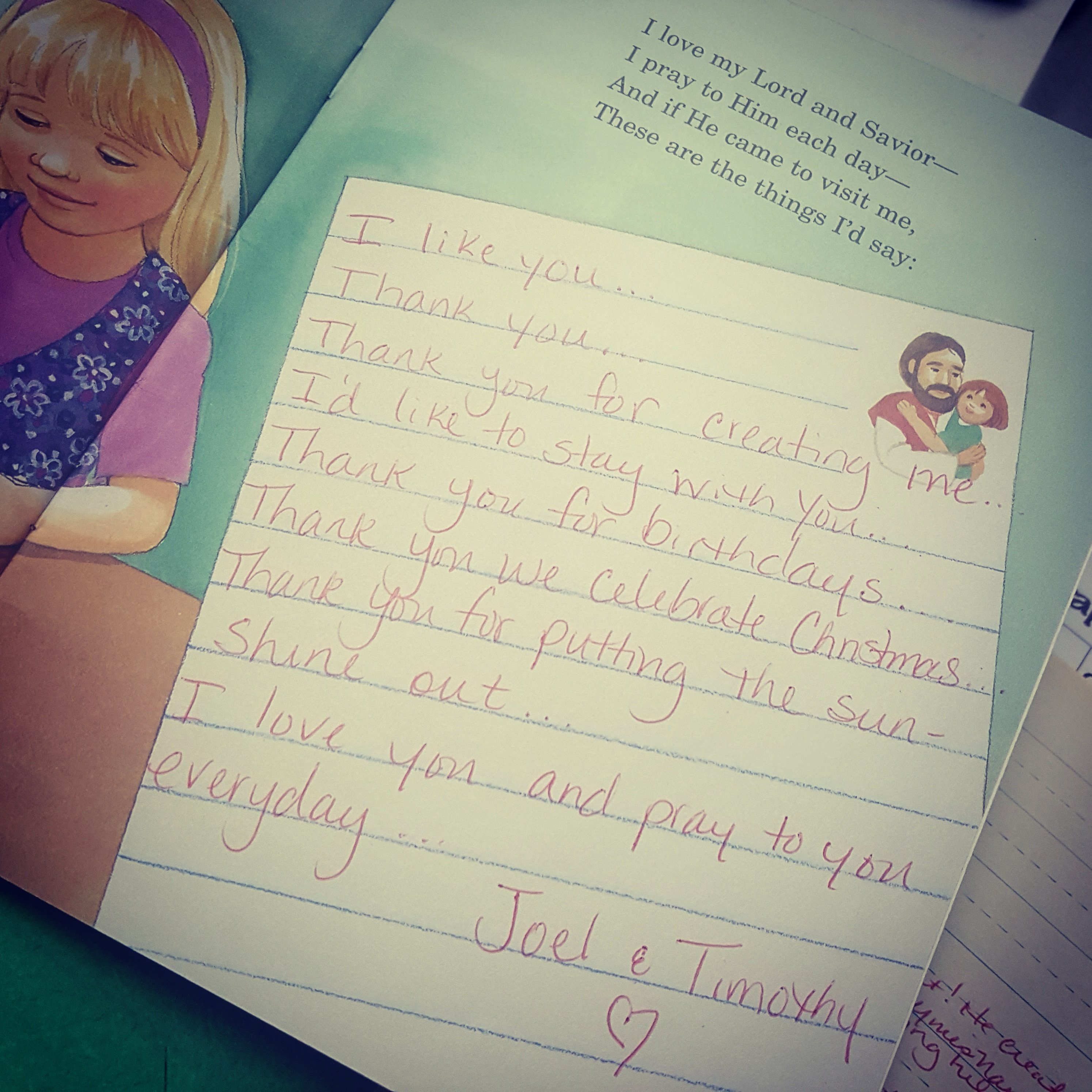 “Thank you for creating me, thanks for birthdays (they’re fun.) Thank you for giving us reason to celebrate Christmas (and Easter.) Oh, and thanks for putting the sunshine out (it feels warm on my face!) I like you, Jesus (I’m glad you like me too!) I love you so much (I’d like to stay with you!)”
